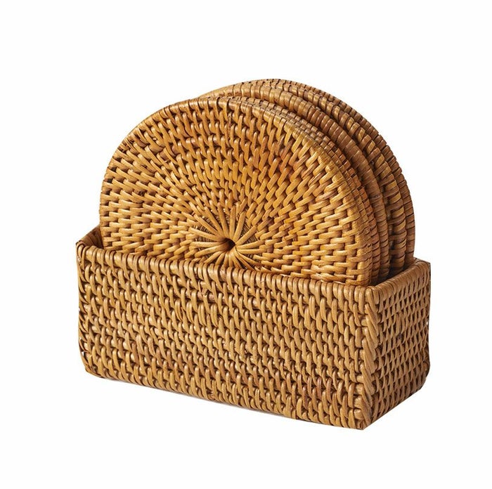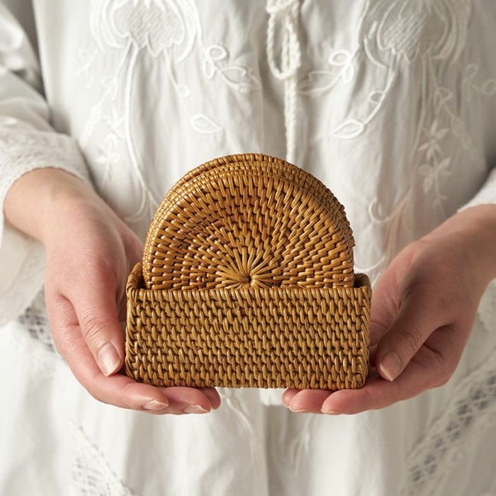 一つ一つ、すべて手作業で作られるため多少の個体差はありますが、こちらのコースターは直径約10cmのものが6枚セットになり、専用のケースに収納されています。グラスと一緒に収納しておけば場所を取らず、急な来客時にもスマートにお茶を出せます。冷たい飲み物はもちろん、温かいお茶の茶たくとしてもお使いいただけます。ケースまでアタで作られているところがとてもかわいいです。