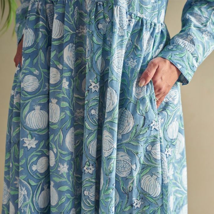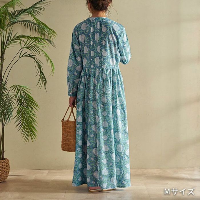 落ち着きのあるブルー地に、グリーンで描かれた葉っぱの爽やかさがプラスされた、清々しいブロックプリントワンピース。袖はフルレングスで、胸元のピンタックが上半身をスッキリ見せてくれます。ボタンを上まで留めると、きちんと感も出る女性らしいワンピースです。