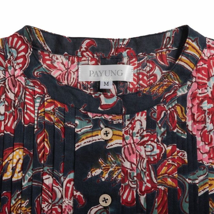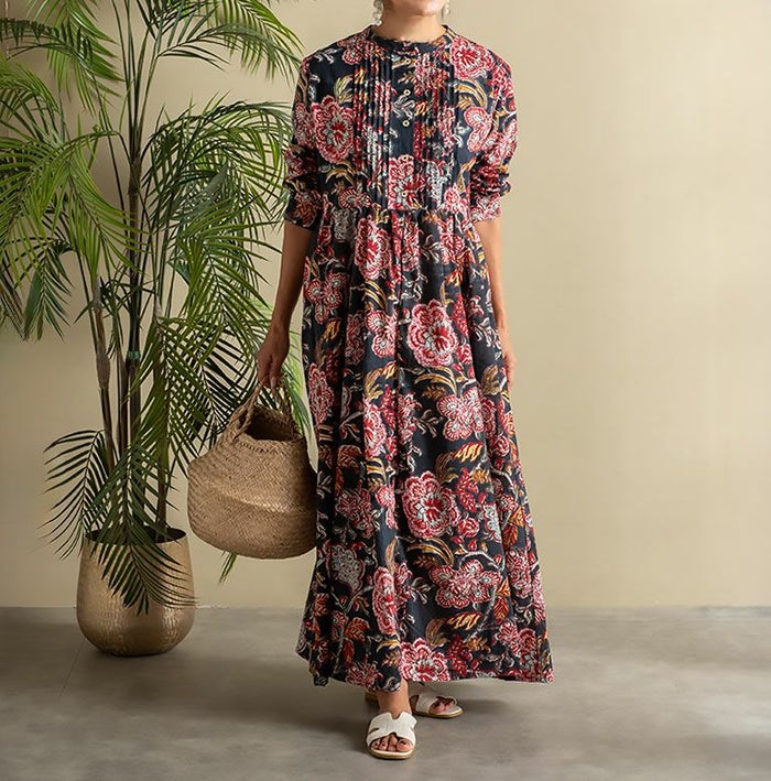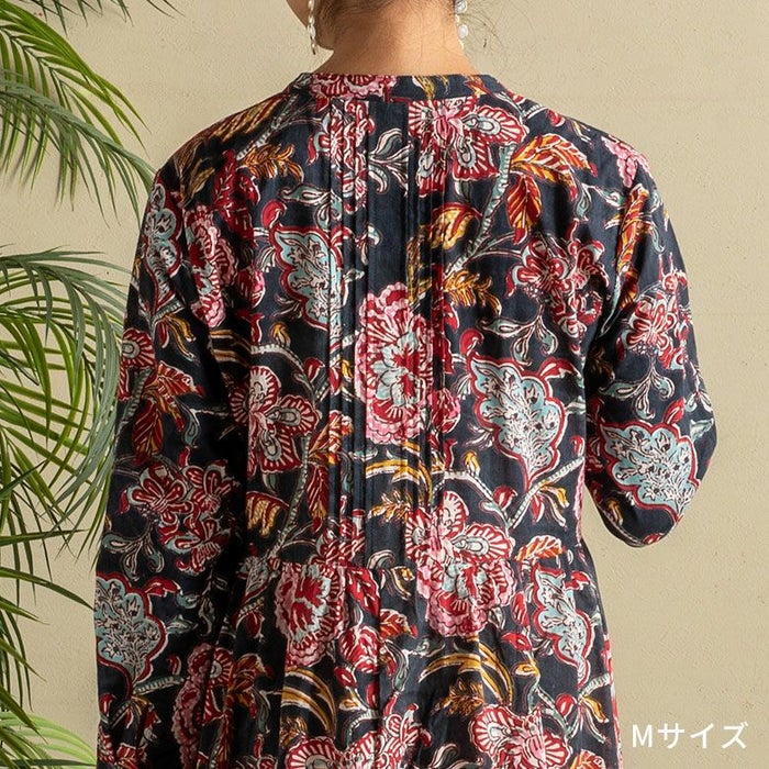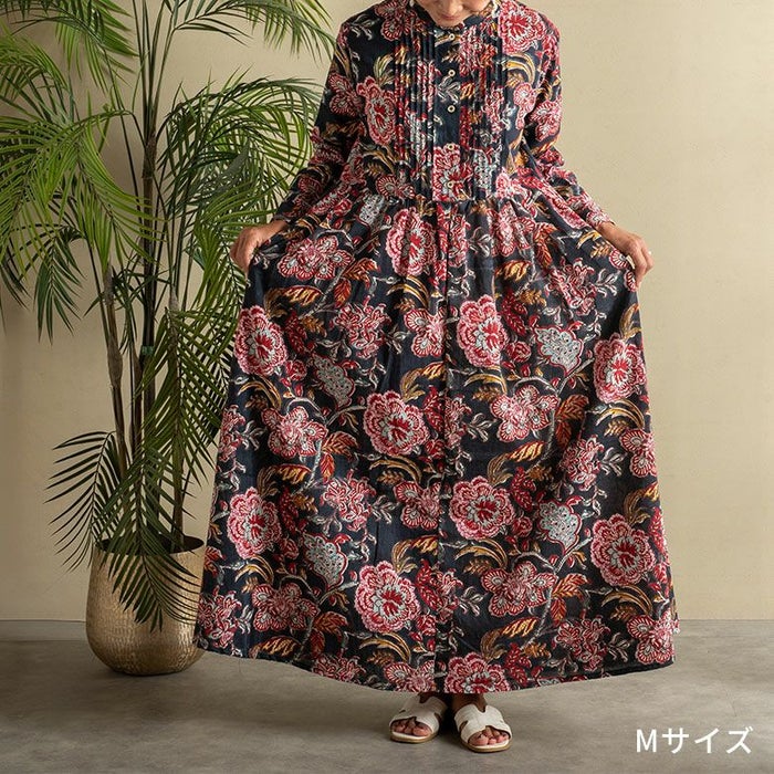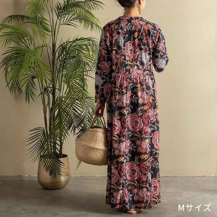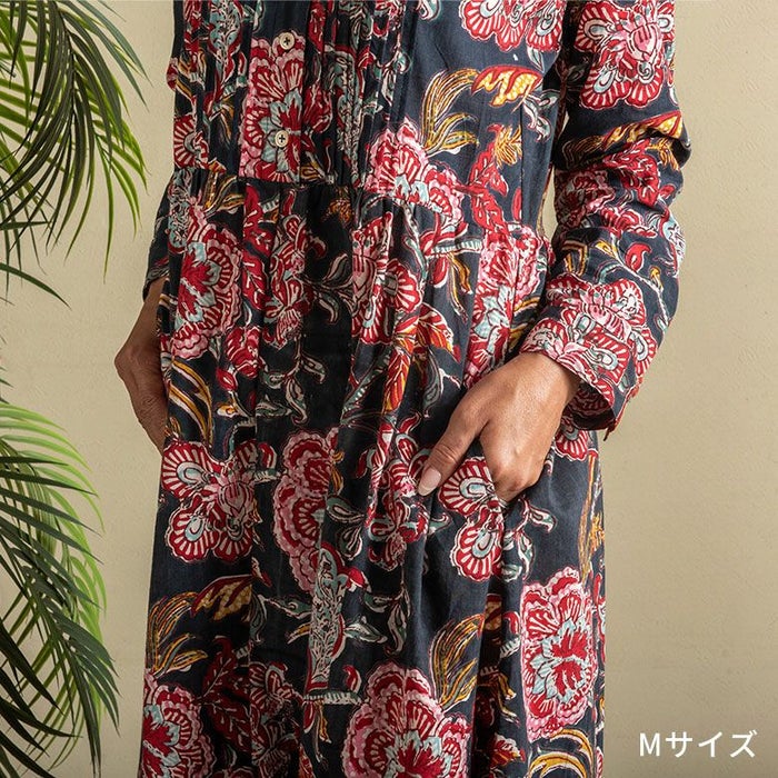 生地にはインドのブロックプリントを使用。絵柄の中に大小さまざまなモチーフが施され、ブロックプリントならではのかすれやにじみがワンピース全体に立体感を与えます。シンプルなシルエットながら、奥行きのある雰囲気を醸し出してくれるのも魅力。ベースは真っ黒に近い炭色で、黒だと重くなりがちな春〜秋も軽やかに着ていただけます。