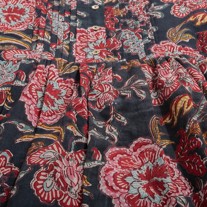 シックなチャコール(炭黒色)のベースに、華やかなレッドやピンクを合わせた大人のブロックプリントワンピース。華やかでありながら、くすみ感のあるカラーリングなので派手になりすぎず、レストランでのランチやディナー、観劇などにも着ていきたくなる一着です。
