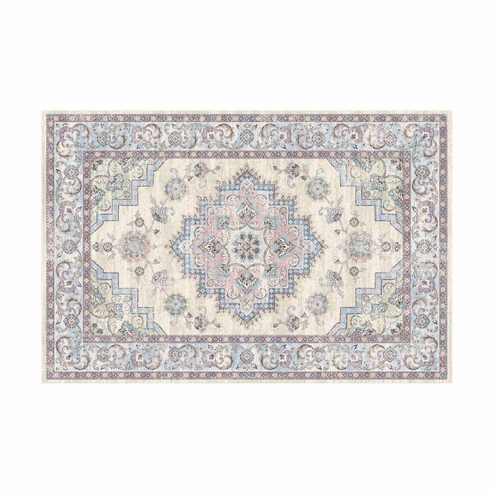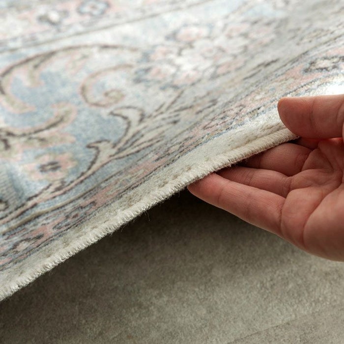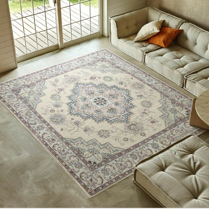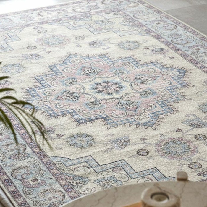 アイボリーベースに、淡いブルーとピンクでモチーフが描かれた優しいカラーのラグ。控え目な色合いながら、このラグを敷くことでお部屋が明るく感じられます。