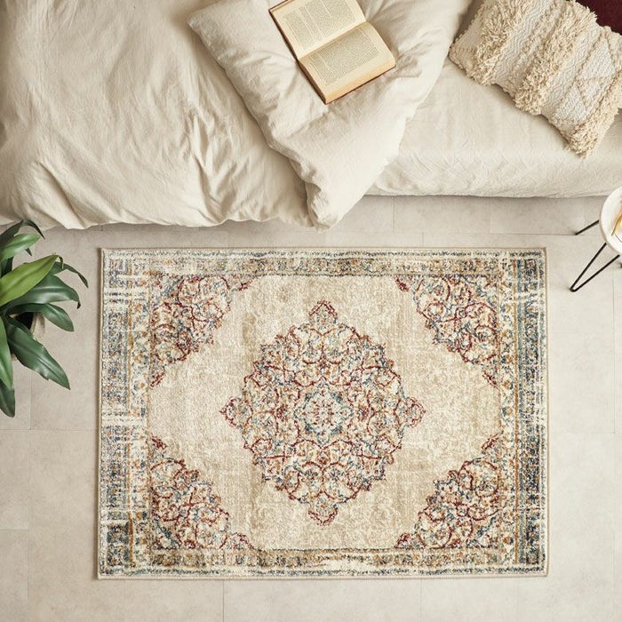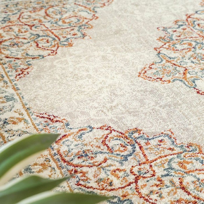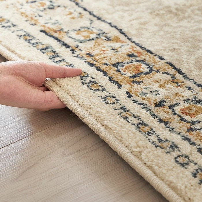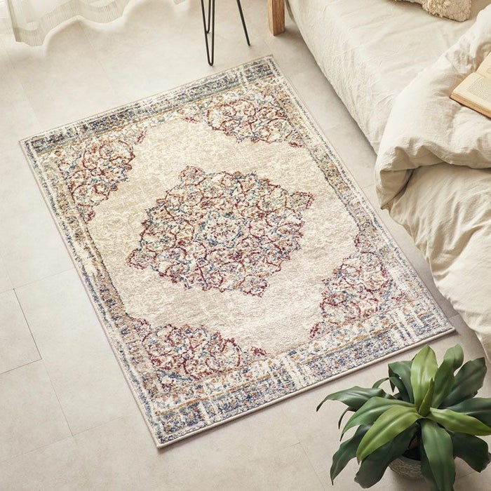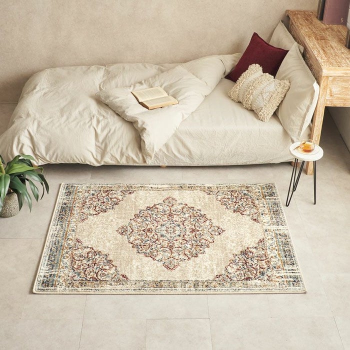 ラグの中心には「メダリオン(記章)」と呼ばれる大きなモチーフがあり、各コーナーにも模様が配置されています。メダリオンは建築やファッションなどさまざまな分野で使われる伝統的なデザイン。ラグ全体に柄があるタイプに比べ、中央に柄が集まることで視線が自然と中心に集まり、お部屋を広く見せる効果が期待できます。