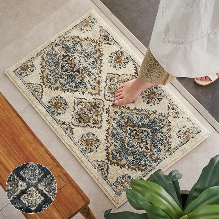 当店のラグの中で一番人気の柄が小さいサイズで登場。どちらもヴィンテージ風の落ち着きのあるカラーで大人のシンプルなインテリアにもマッチします。明るい色の床材にはアイボリーを、ダークな色合いの床材にはネイビーを合わせるとより馴染みやすくなりますよ。ウッディーな家具や観葉植物とのコーディネートも素敵なヴィンテージ風のデザインです♪