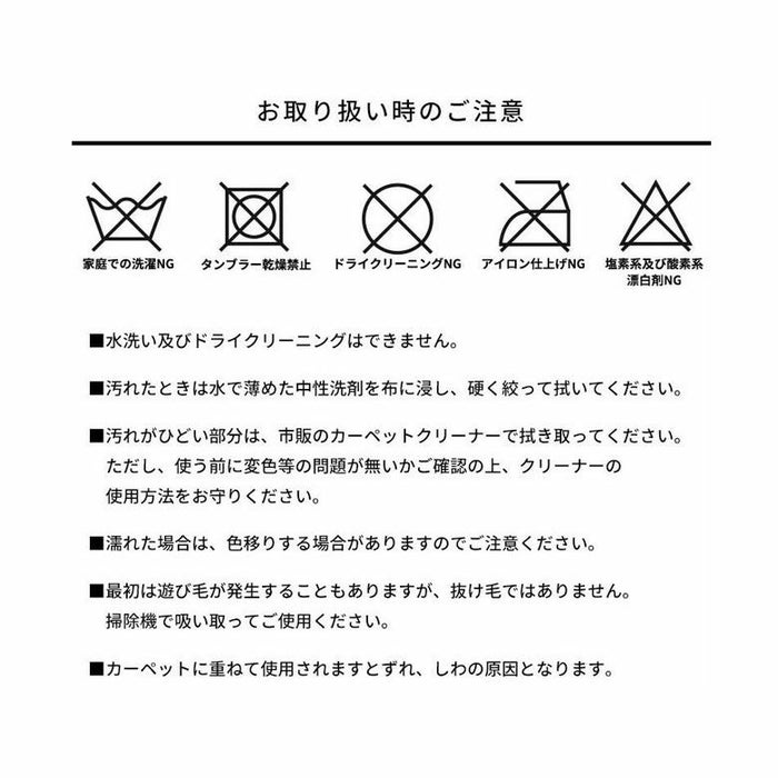 ・水洗い及びドライクリーニングはできません。 ・汚れたときは水で薄めた中性洗剤を布に浸し、硬く絞って拭いてください。 ・汚れがひどい部分は、市販のカーペットクリーナーで拭き取ってください。ただし、使う前に変色等の問題が無いかご確認の上、クリーナーの使用方法をお守りください。 ・濡れた場合は、色移りする場合がありますのでご注意ください。 ・最初遊び毛が発生することもありますが、抜け毛ではありません。掃除機で吸い取ってご使用ください。 |