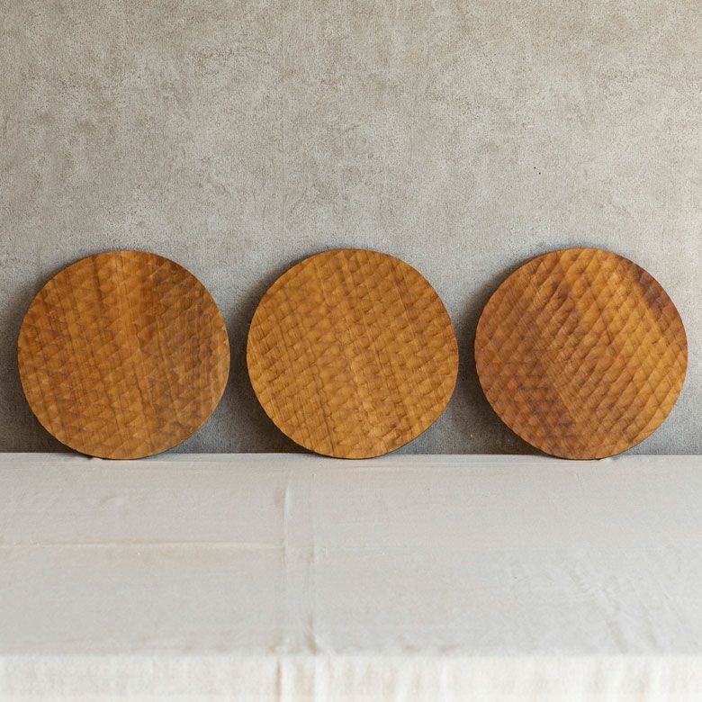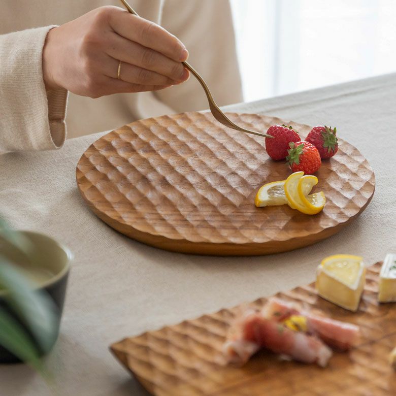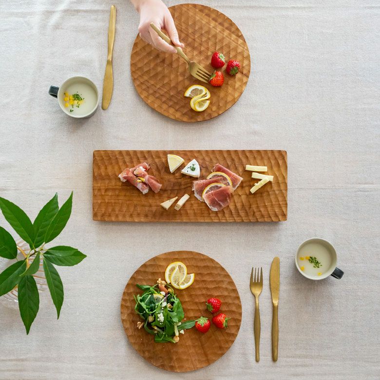 チーク無垢材の1枚板を、丁寧に彫って作られた贅沢なプレートは天然素材のほっこりとした温かみを食卓にプラスしてくれます。