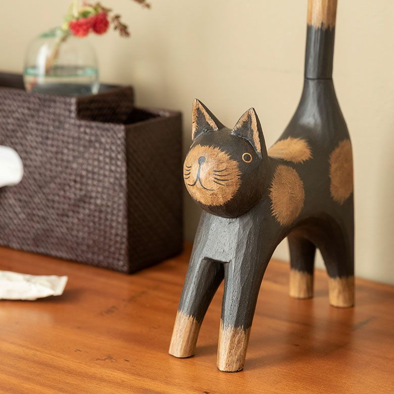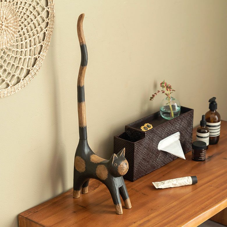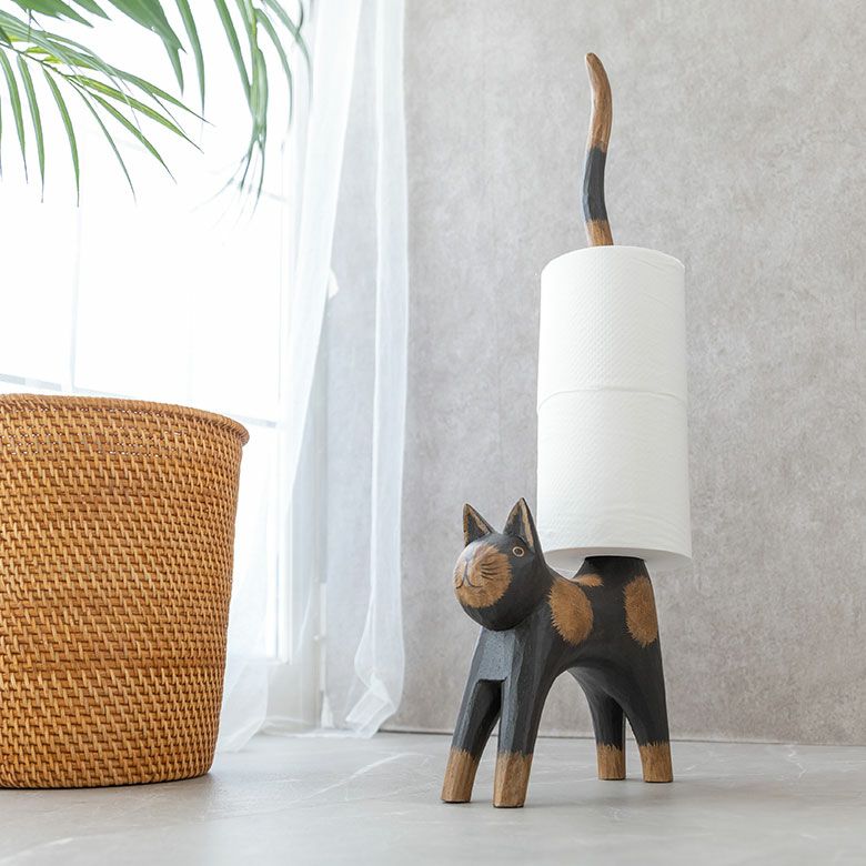 しっぽでトイレットペーパーを持ってくれる木彫りのネコのオブジェ。