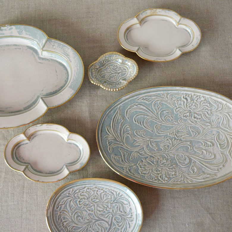 ハクア(白亜)は真っ白とは少し違った柔らかな灰白色。縁に金が施してありアンティークのような上品な色合いです。焼け具合で色の出方の異なる釉薬が使われていて、一枚一枚違った表情が楽しめます。複数枚買われると一枚毎に色味が違うことがありますが、それも焼物の良さとしてお楽しみ頂ければと思います。