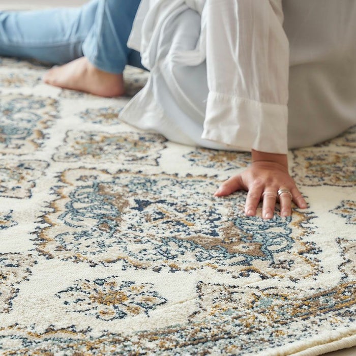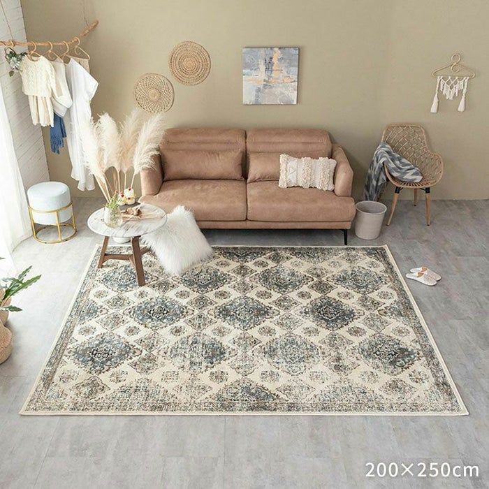 200×250㎝のラグは広めのリビングにピッタリのサイズ感。3シーターのソファの前にも安心感のさるサイズです。