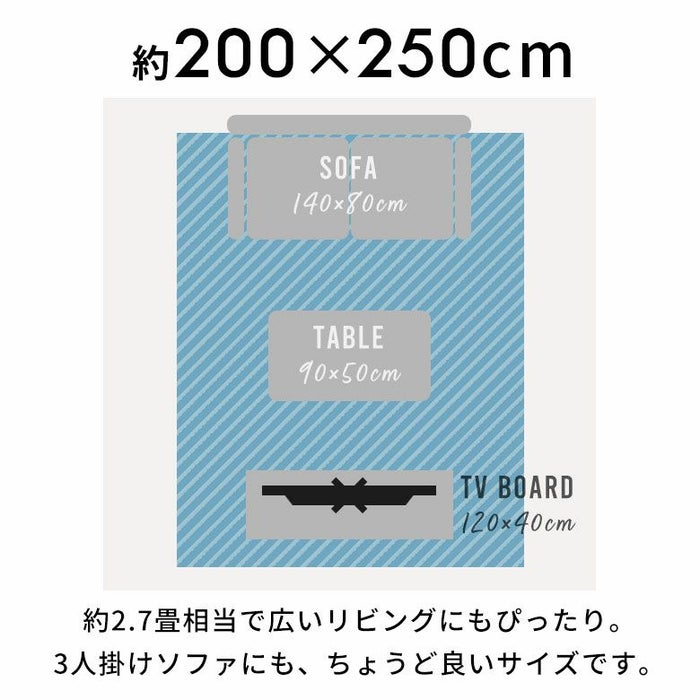 こちらの200×250㎝の大きさは、3シーターのソファの前に置くとぴったりな大き目サイズ。広めのリビングやお部屋いっぱいにラグを敷きたいときにちょうどいいサイズです。