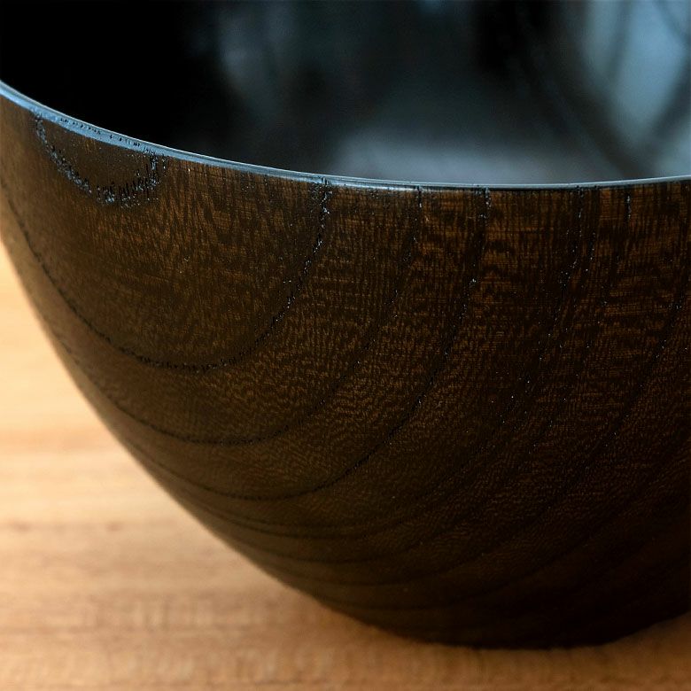 縁の辺りは薄くなっていますが天然木の欅で作っていますので熱々のスープや丼ものなどを入れても熱さを感じにくい器です。