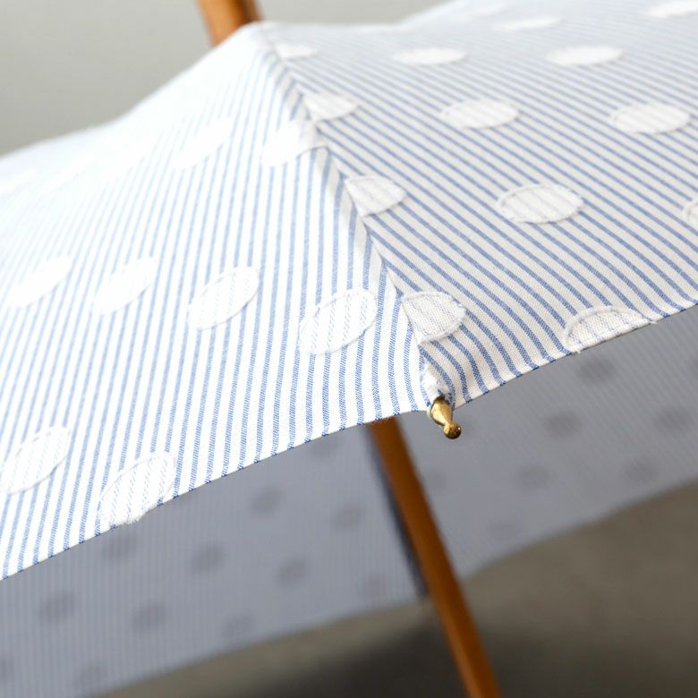 爽やかなストライプの生地に、水玉模様の刺繍を施した可愛らしいデザインの日傘です。