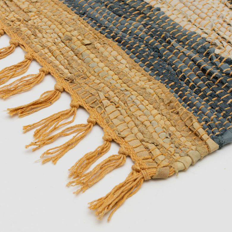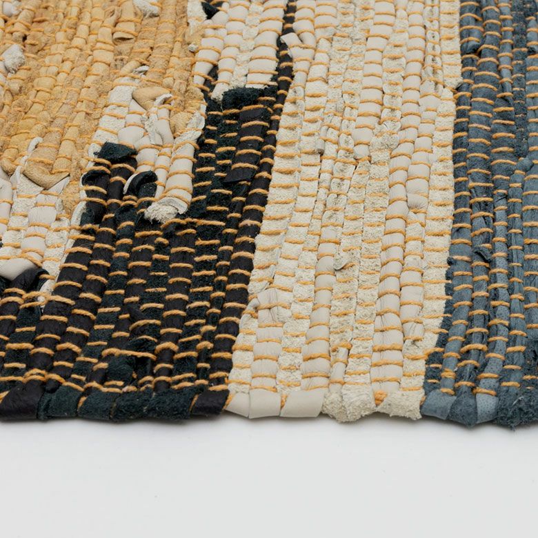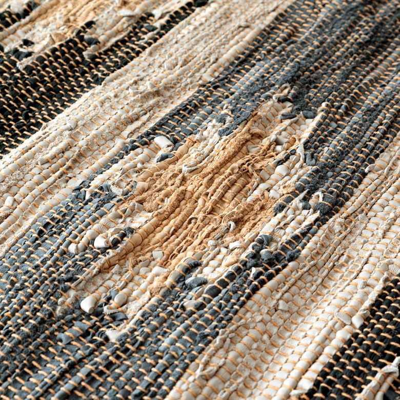 裂いたレザーをキリム柄に織り込み、自然な風合いを生かしたお洒落なラグです。