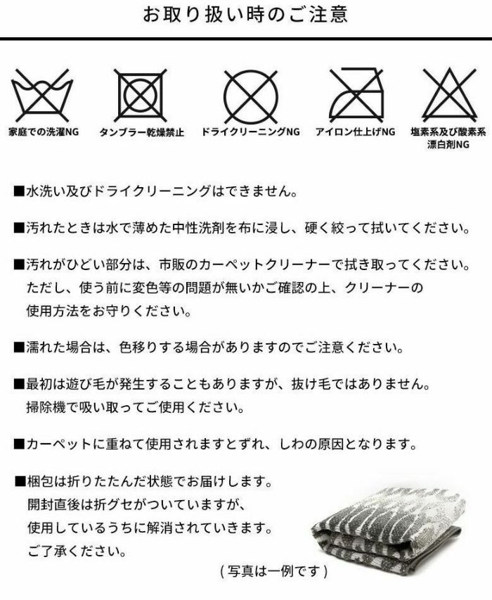 ・水洗い及びドライクリーニングはできません。 ・汚れたときは水で薄めた中性洗剤を布に浸し、硬く絞って拭いてください。 ・汚れがひどい部分は、市販のカーペットクリーナーで拭き取ってください。ただし、使う前に変色等の問題が無いかご確認の上、クリーナーの使用方法をお守りください。 ・濡れた場合は、色移りする場合がありますのでご注意ください。 ・最初遊び毛が発生することもありますが、抜け毛ではありません。掃除機で吸い取ってご使用ください。 |
