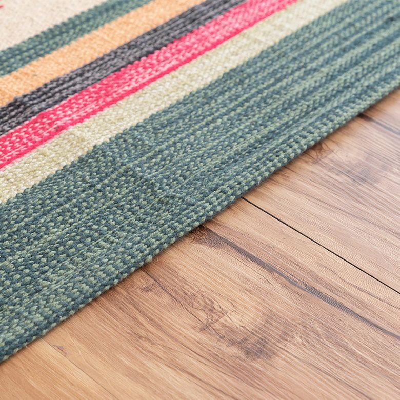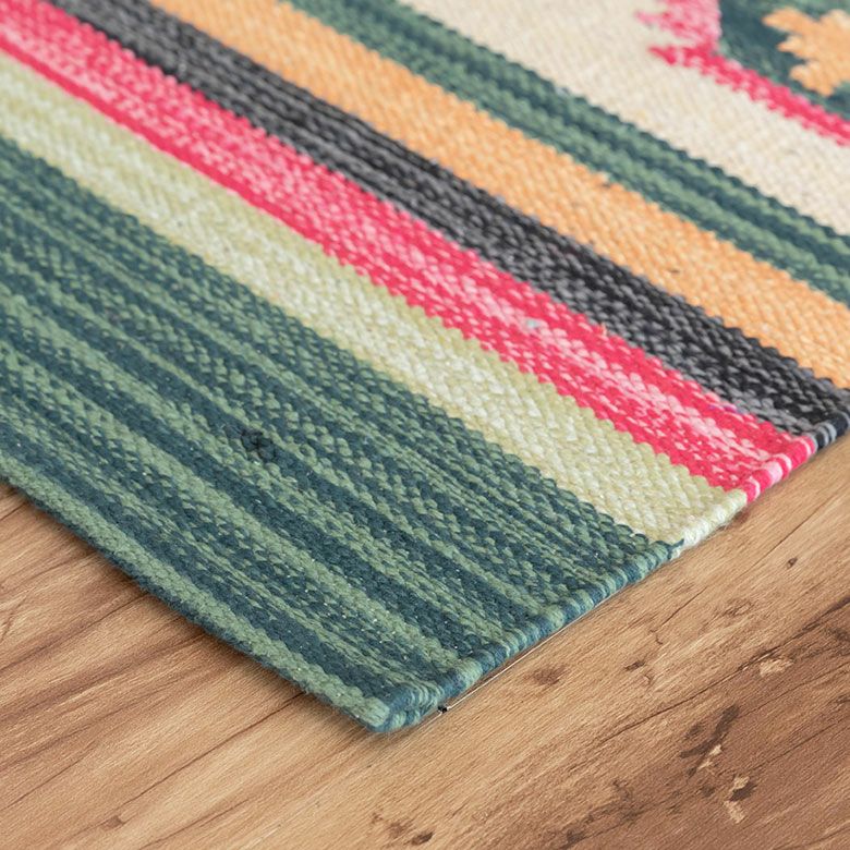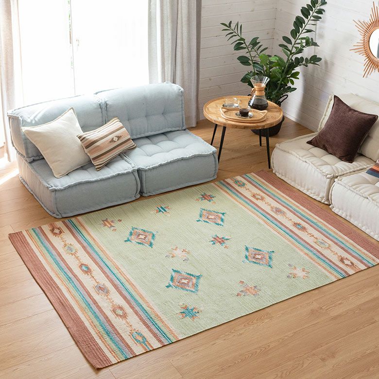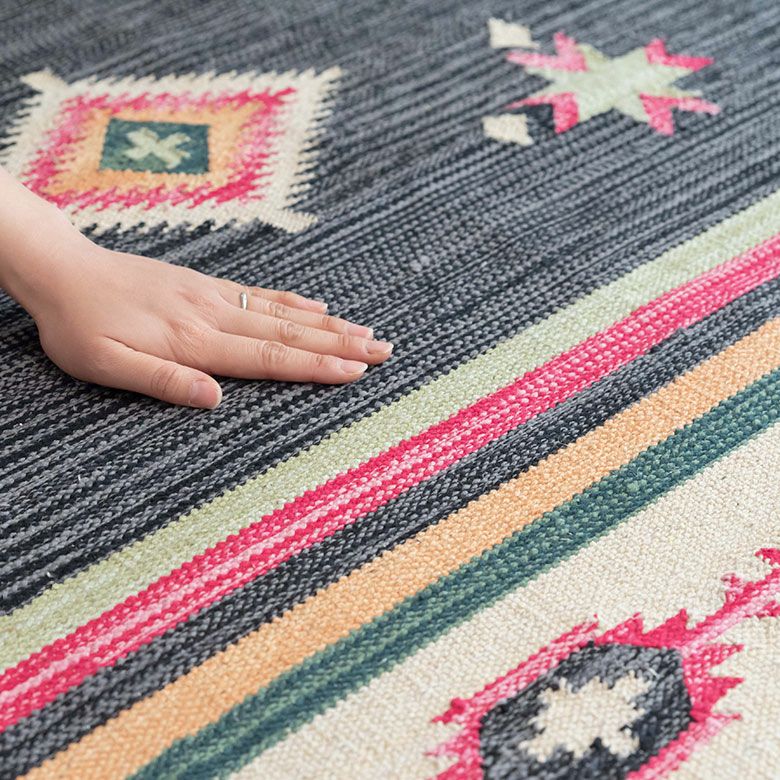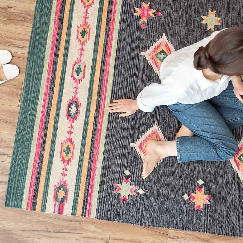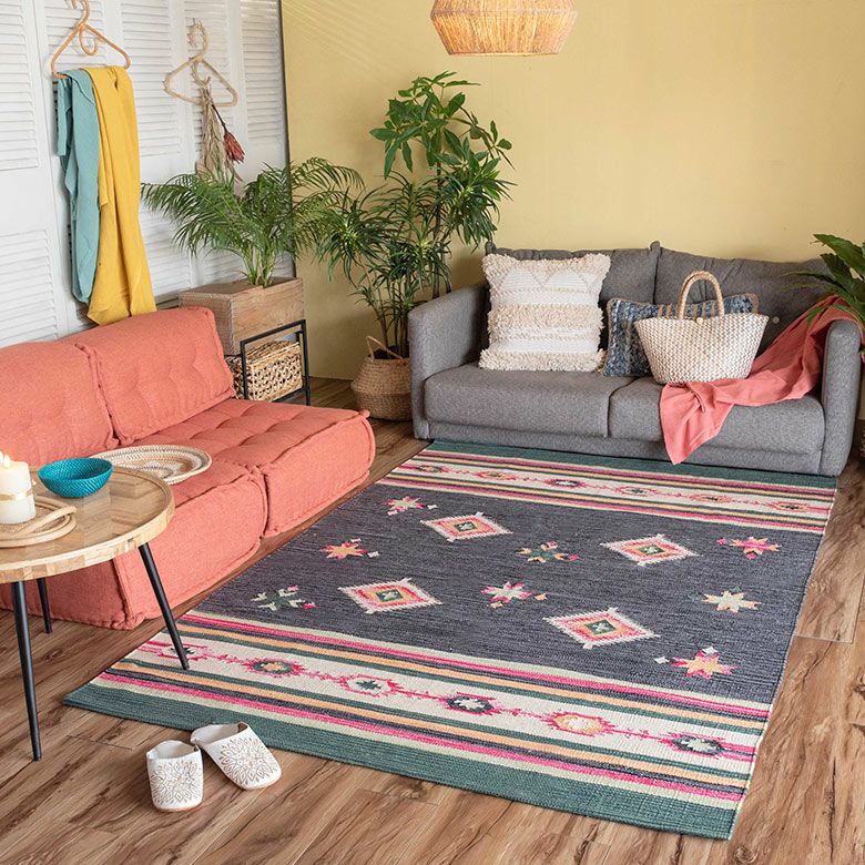 コットン100%のオールシーズン使いやすく、目を惹く色味がお部屋のアクセントになるキリムラグ。