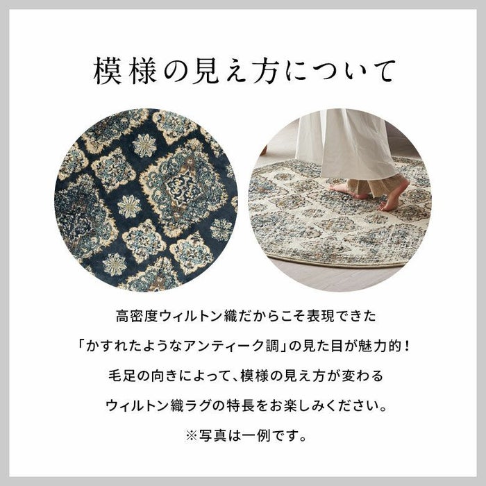 ややかすれたこなれ感のあるこちらのラグは、糸を贅沢に使ったウィルトン織り。 はっきりとプリントされた柄と違い、毛並みの方向によって見え方が違い、立体感のある表情豊かなラグです。