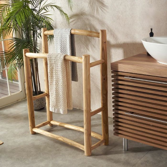 バリ島のヴィラやお店で見かけるような、チークの無垢材をそのまま活かしたタオルハンガーは、ナチュラルな色と質感が最大の魅力。高さの違う二本のバーにタオルをかけるのはもちろん、ストールや旅先で買ったお気に入りの布を掛けるのにも最適です。チークの自然なカーブがインテリアの一部になり、掛けたものを魅力的に見せてくれます。