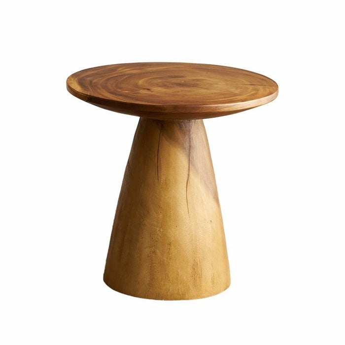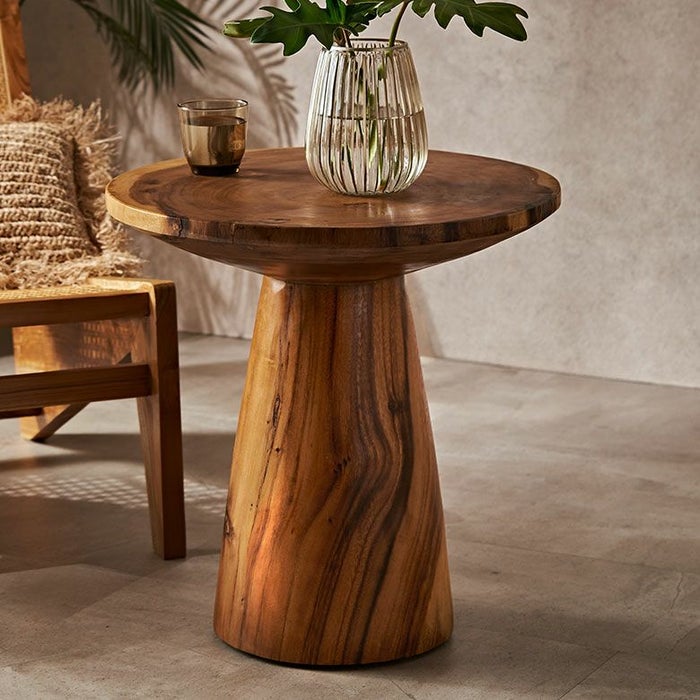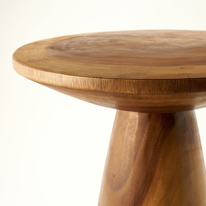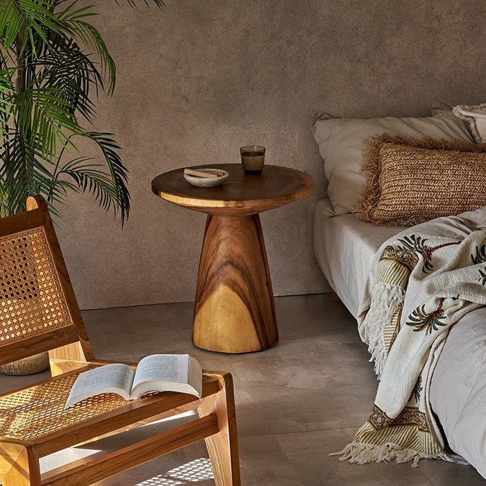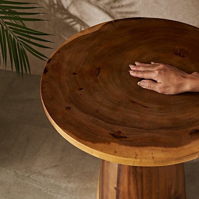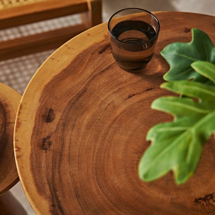 このサイドテーブルは、一本の木から削り出した素材をインドネシアの職人が一つ一つ丁寧に加工し、まるでアートのような仕上がり。木目をそのまま生かしており、経年変化を楽しめるアンティークフィニッシュで、二つとして同じものはありません。釘やネジ、接着剤を使わず、100%天然素材で制作された家具です。ワックス仕上げでモンキーポッドの木目を最大限に引き立てています。シンプルなフォルムだからこそ、木の杢(もく)が主役となり、控えめながら強い存在感を放ちます。