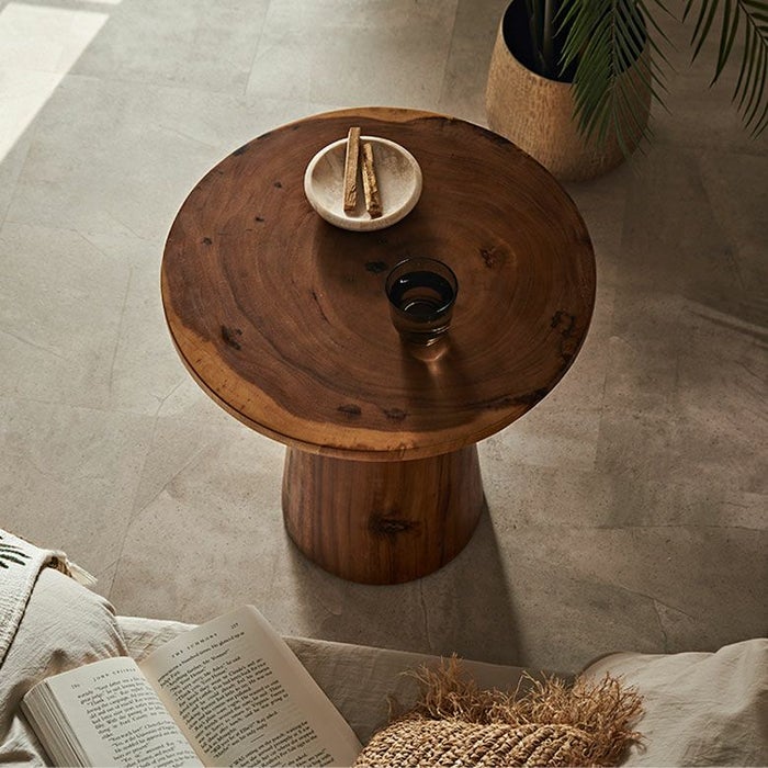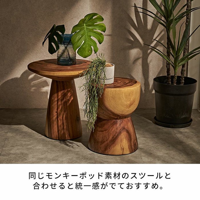 大木をくり抜いて作られた美しいスツールは、モンキーポッドツリー(スワールウッド)と呼ばれる大きな木から削り出されたもの。南米ウォルナットとも呼ばれるモンキーポッドを贅沢に使用し、サイドテーブルとしてしっかりとした安定感と存在感を放ちます。高さは50cmで、ベッドサイドやソファサイドから手が届くちょうどいい高さ。家具横のちょこっと置きにもぴったりで、観葉植物と合わせたディスプレイコーナーとしても、重厚感ある木目がグリーンを引き立て、品よく空間をまとめてくれます。