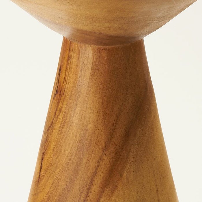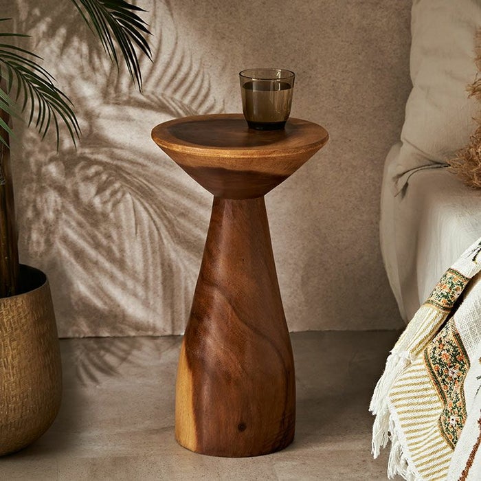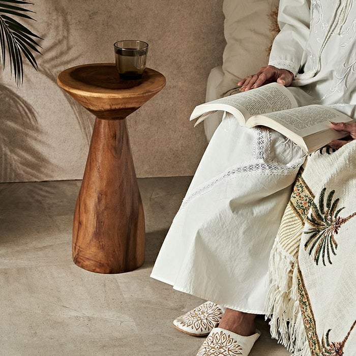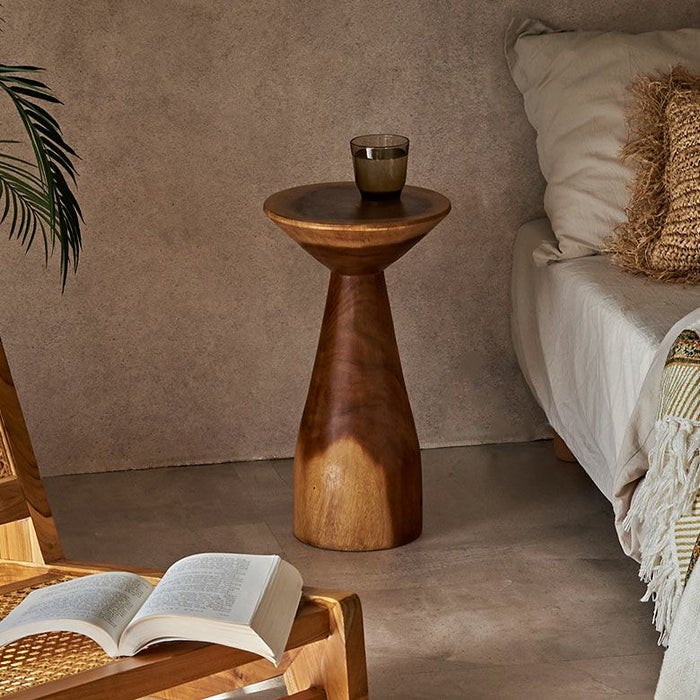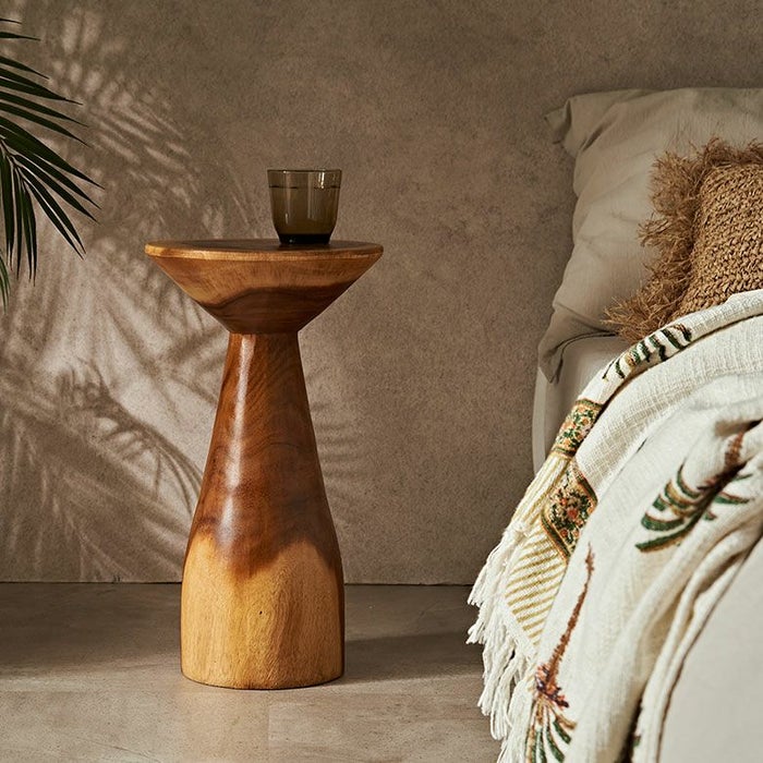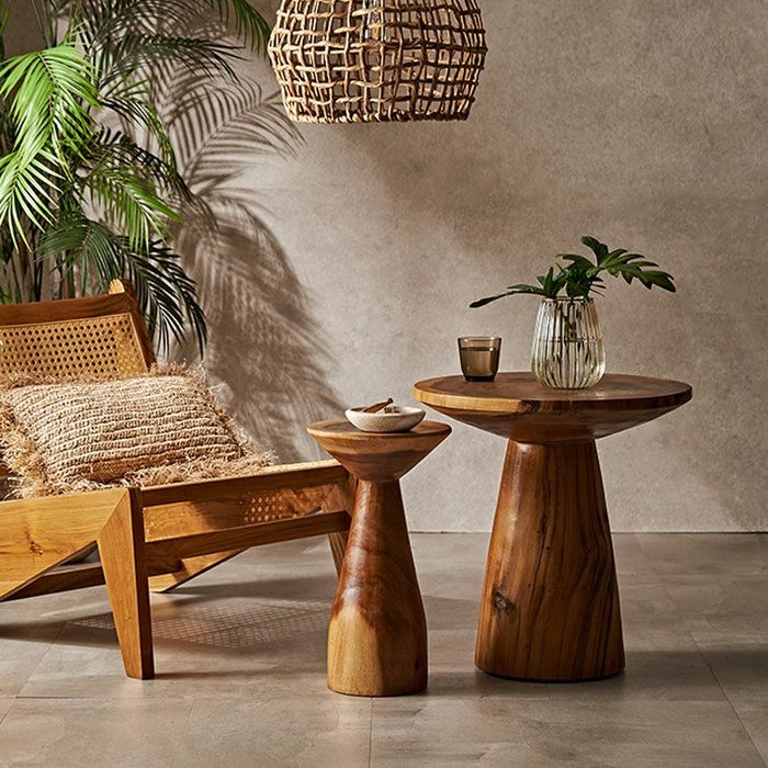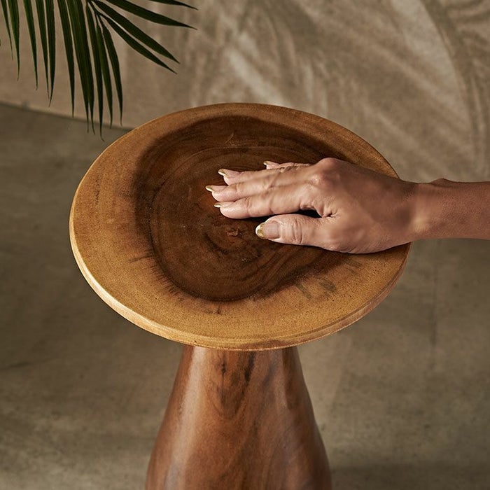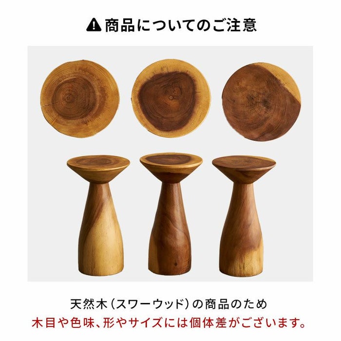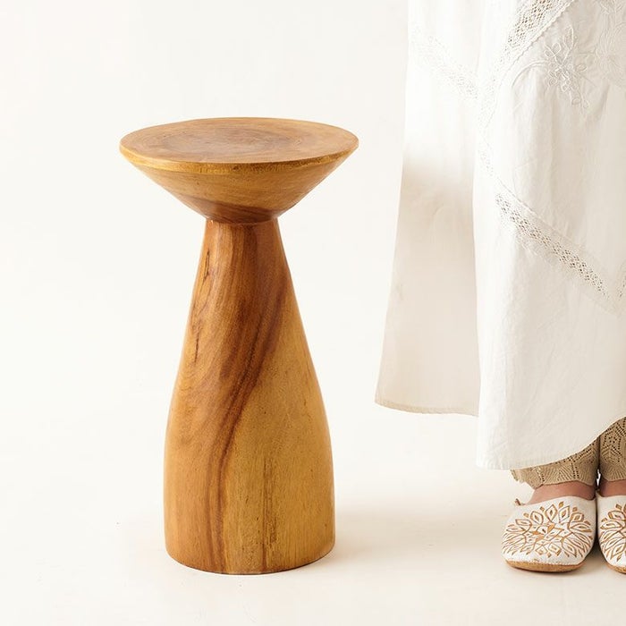 こちらのサイドテーブルは、一本の木から削り出した材料を、インドネシアの職人の手で一彫り一彫り丁寧に形作られており、木目をそのまま生かしているので、二つとして同じものはありません。釘や接着剤を一切使わず、100%ナチュラルな素材を活かした、土に還るサステナブルなサイドテーブルです。塗装も施しておらず、素材の美しさを最大限に活かしたアイテムです。