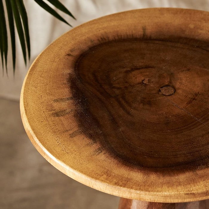 スリムなサイズ感で、お部屋の隙間を魅力的なディスプレイコーナーに変えてくれるこちらのスツールは、モンキーポッドツリー(スワールウッド)と呼ばれる大木から削り出されたものです。南米ウォルナットとも呼ばれるモンキーポッドを贅沢に使用し、スツールとしても、コンパクトなサイドテーブルとしてもお使いいただけます。