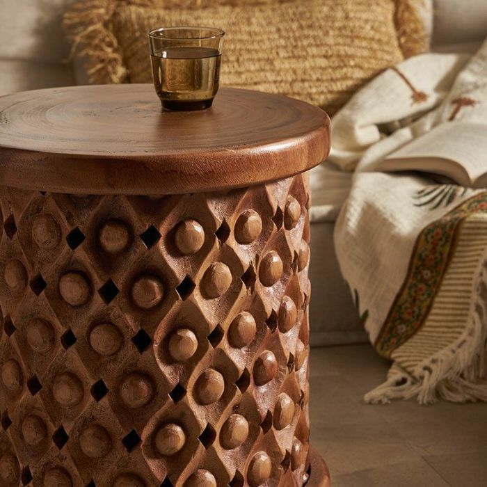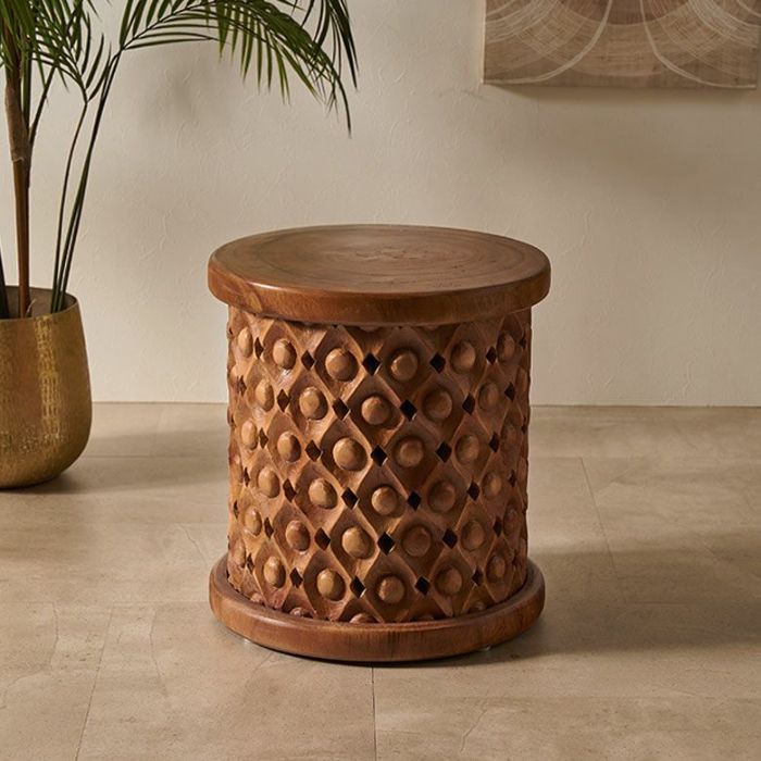 こちらのスツールは一本の木から削り出した材料をインドネシアの職人の手で一彫り、一彫り丁寧に彫刻が施されており、まるでアートのような仕上がり。木目をそのまま生かしているので二つとして同じものはありません。東南アジアのリゾートホテルのようなシックで品のいいインテリアにピッタリなスツールです。お手持ちのファブリックやレザーのソファとの合わせ、アタやラフィアの天然素材との合わせはインテリアに奥深さを与え、お部屋に落ち着いた雰囲気を与えてくれます。