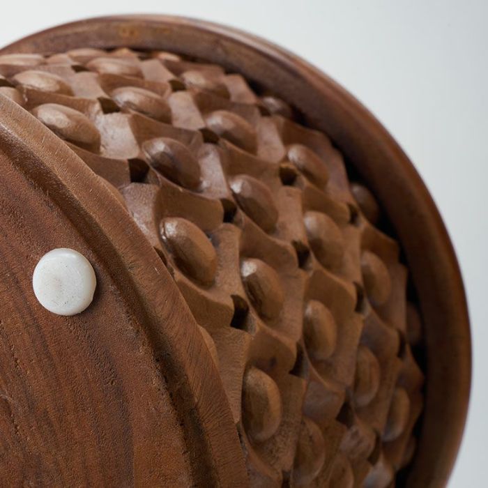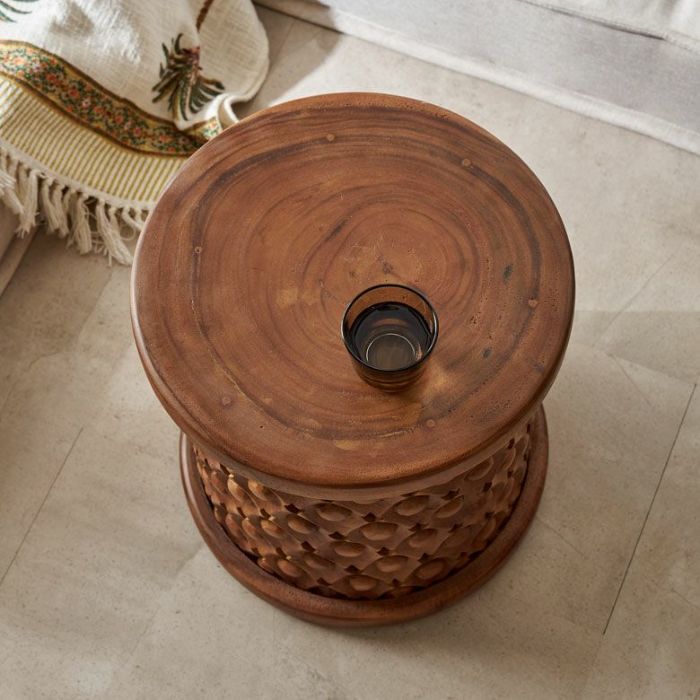 手彫りの凹凸が生み出す陰影が美しいこちらのスツールはモンキーポッドツリー(スワールウッド)と言われる大きな木から削り出されたもの。