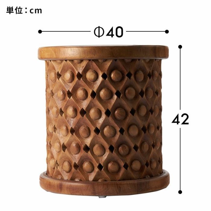 南米ウォルナットとも呼ばれるモンキーポッドを贅沢に使用し、スツールとしてもサイドテーブルとしても存在感を発揮します。高さは42㎝とチェアとしては低めですがしっかりとした安定感があるので玄関やキッチンのちょっとした椅子としての使い方はもちろん、リビングやベッドルームでサイドテーブルとして使うのも◎ 観葉植物と合わせたディスプレイコーナーとしての使い方も重厚感のある木彫りがグリーンをより引き立て品よくまとまってくれます。