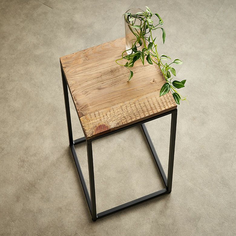 アップサイクルのパインウッド材に、スリムなアイアンスタンドを合わせた