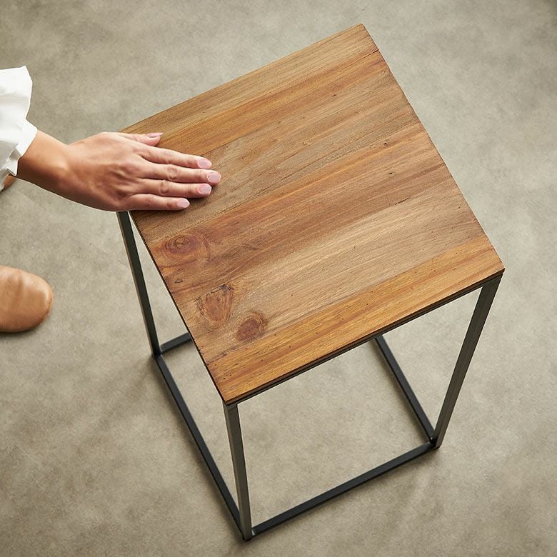アップサイクルのパインウッド材に、スリムなアイアンスタンドを合わせた