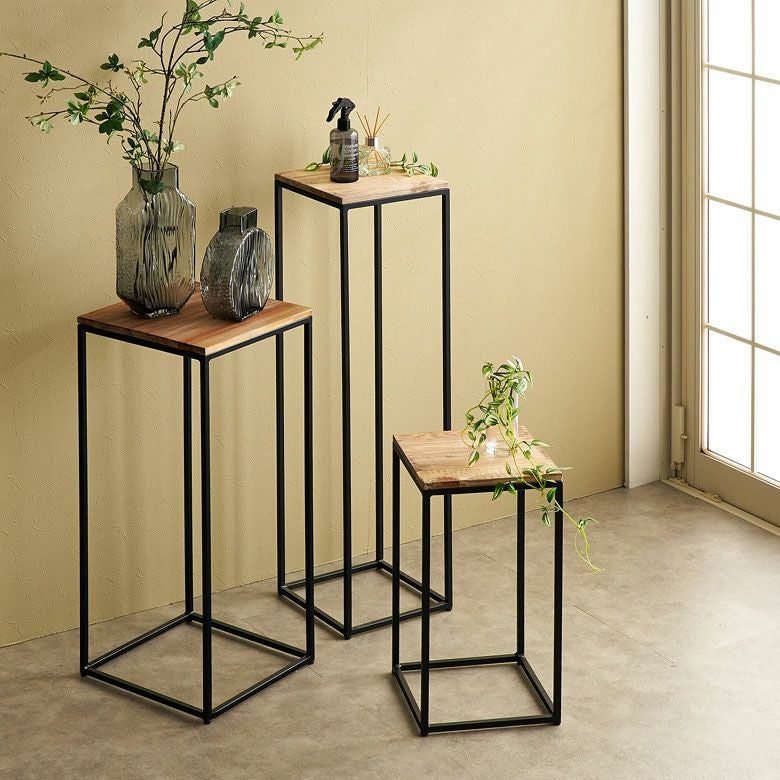 こちらのMサイズは同じシリーズのフラワースタンドSサイズを下に入れ込むことも可能。使わない時には下にSサイズを入れて使う時だけ出す、というネストテーブル使いもできます。