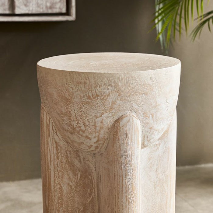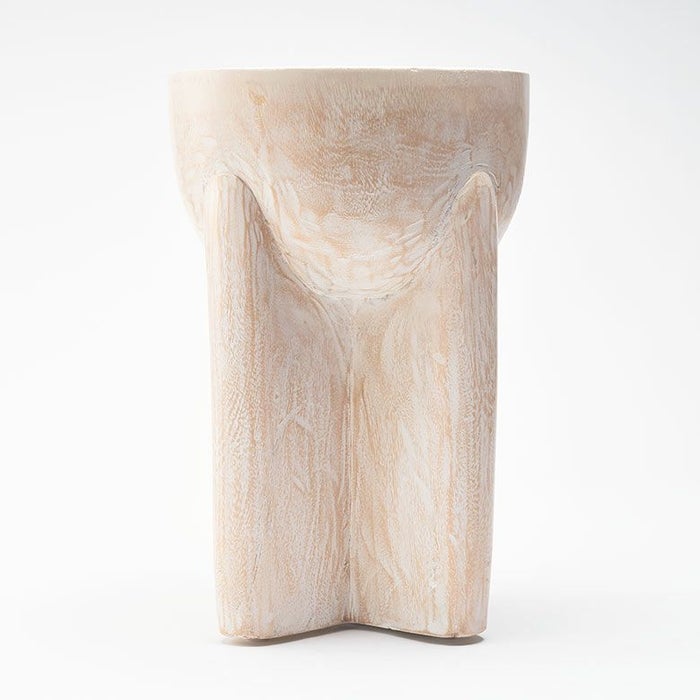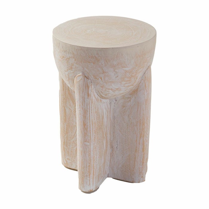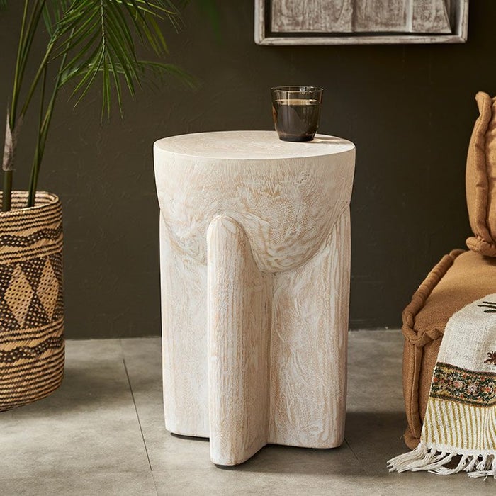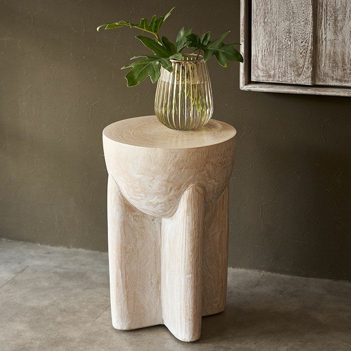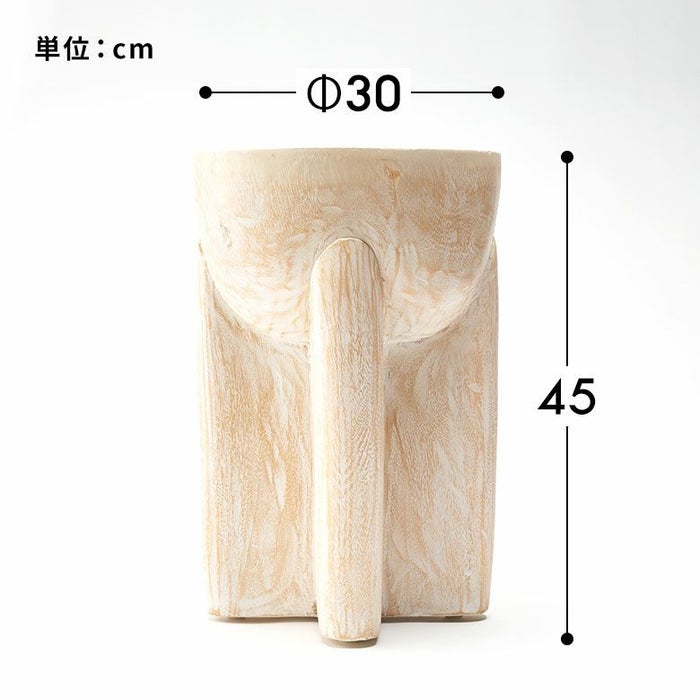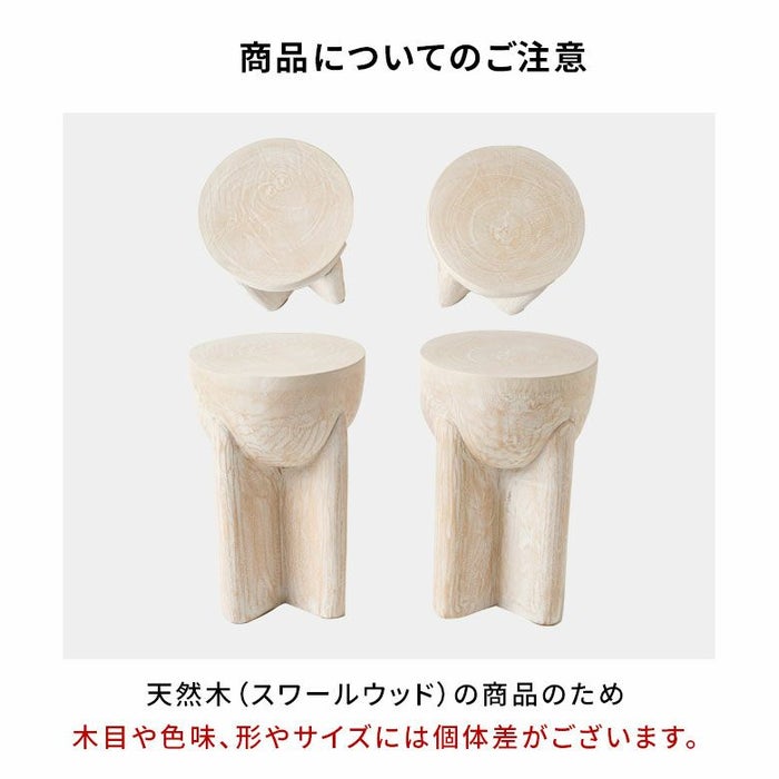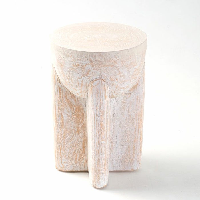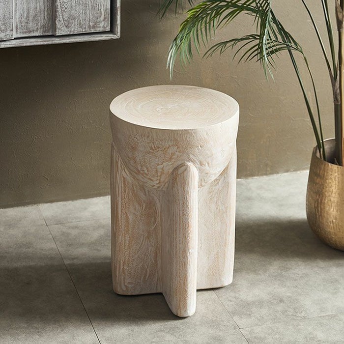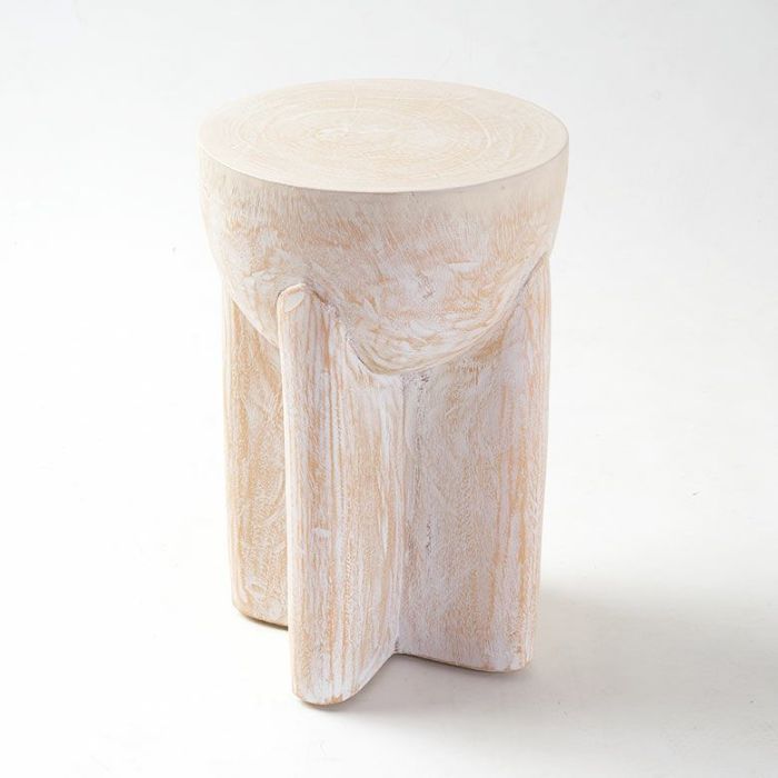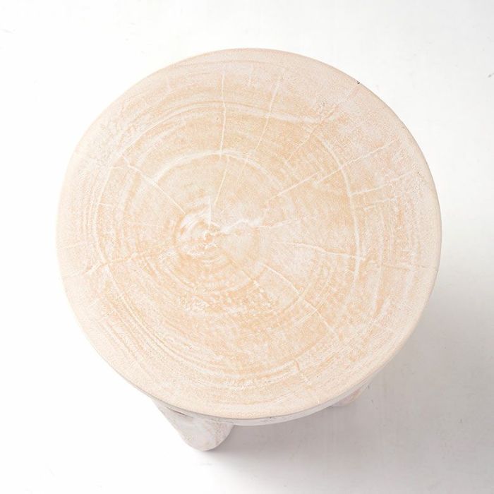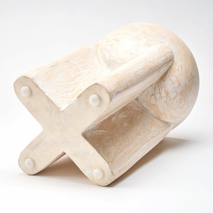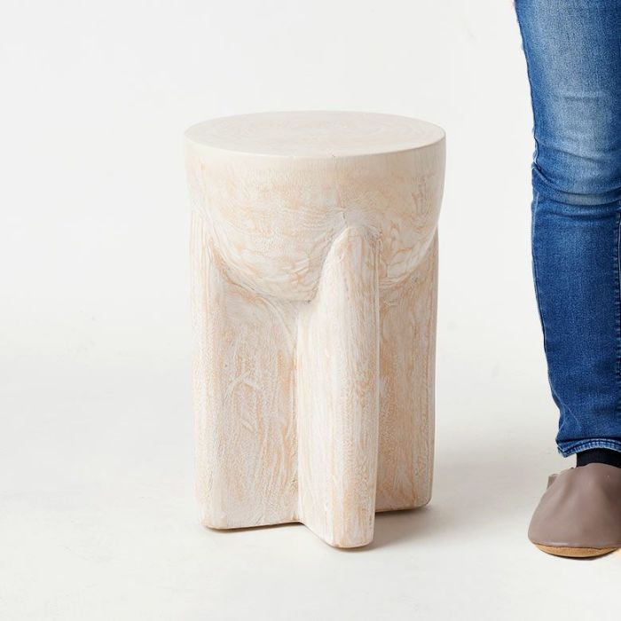 こちらのスツールは、その木目にあえてホワイトウォッシュ加工を施し、ボーホーインテリアや海風の似合う雰囲気に仕上げました。 「ストーンでできているのかな?」と思うようなひんやりとした見た目と、木のぬくもり。その両方が合わさったモダンなスツールです。 デザインは、球を二つに分けたような半球状の座面とクロス脚の組み合わせで、他に見ないアートのような一脚。一本の木から削り出された継ぎ目のない構造で、合わせ方次第でアジアンリゾート風にも北欧風にも、ギリシャの景色の一部のようにもなってくれる、多様性のあるスツールです。