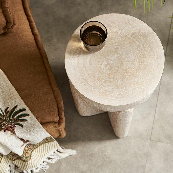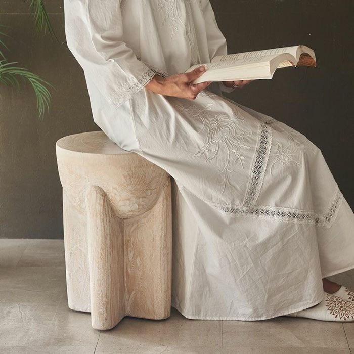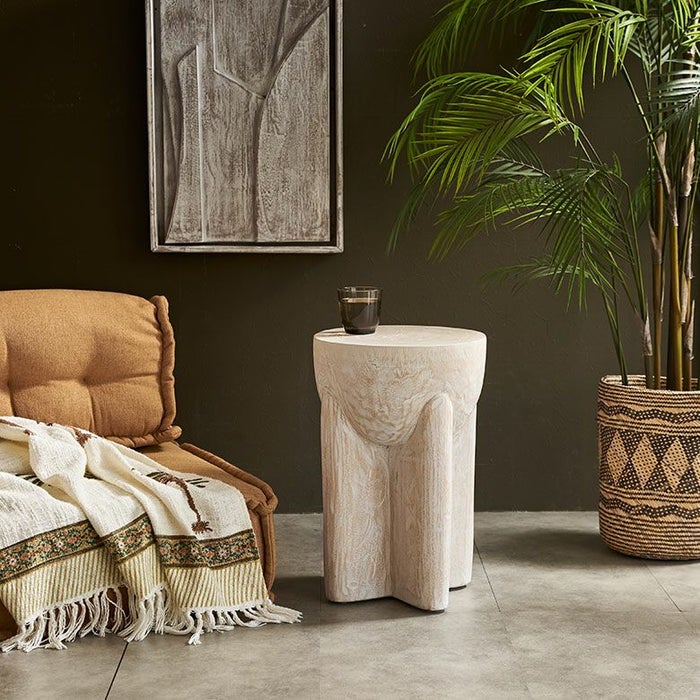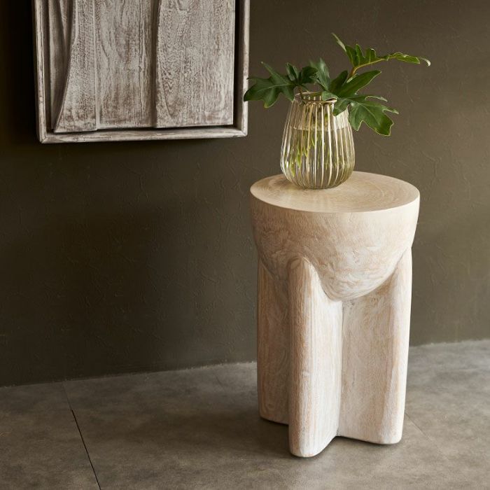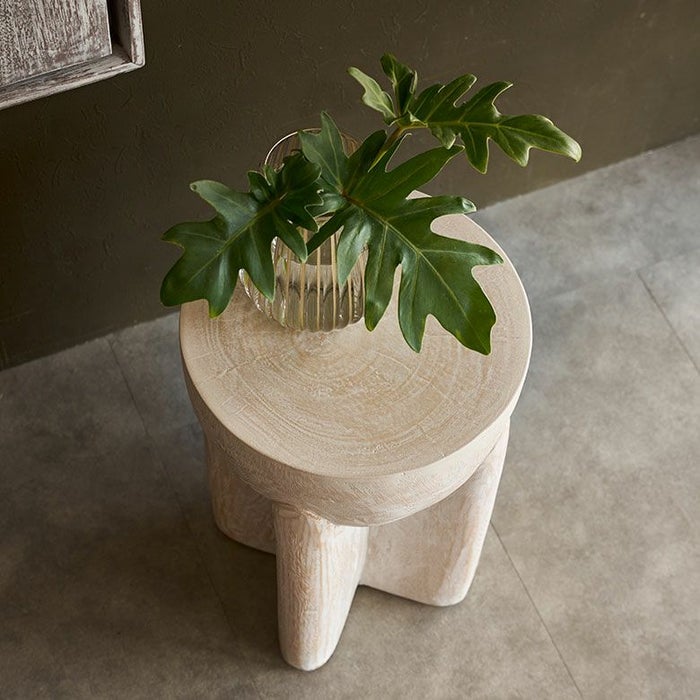 一見ひんやりとしたストーンのように見えるこちらのスツールは、モンキーポッドツリー(スワールウッド)と呼ばれる大きな木から削り出されたもの。 今までにない質感で、お部屋に透明感と新しい空気を運んでくれます。しっかりとした安定感もあるため、玄関やキッチンの椅子としての使用はもちろん、リビングやベッドルームでサイドテーブルとして使うのも◎。観葉植物と合わせたディスプレイコーナーとしての使い方もおすすめで、ホワイトウォッシュとのコントラストが美しく、グリーンをより引き立てて品よくまとまってくれます。
