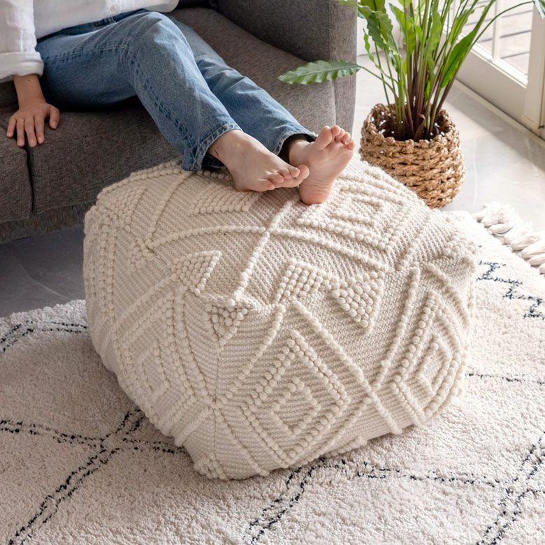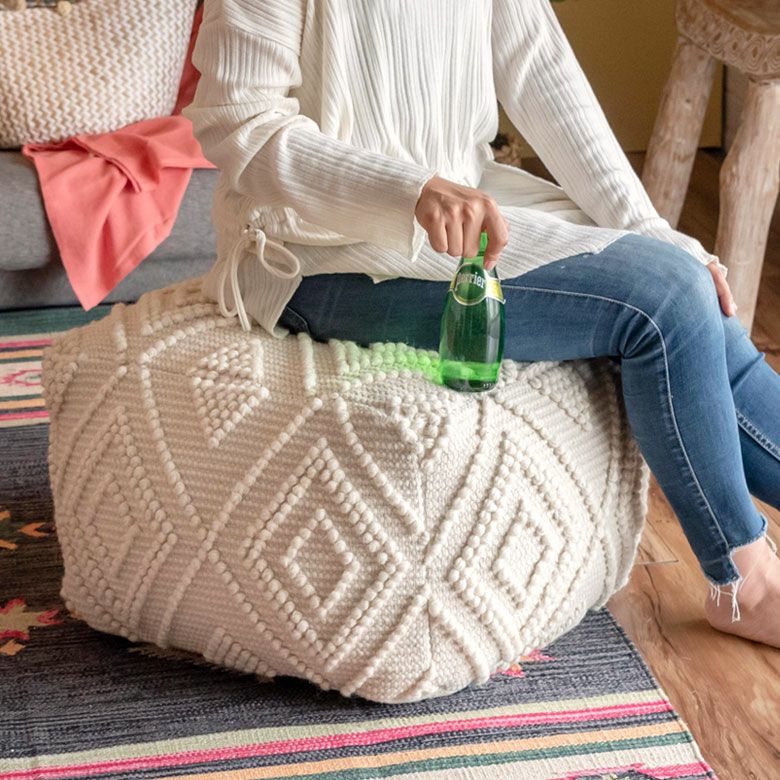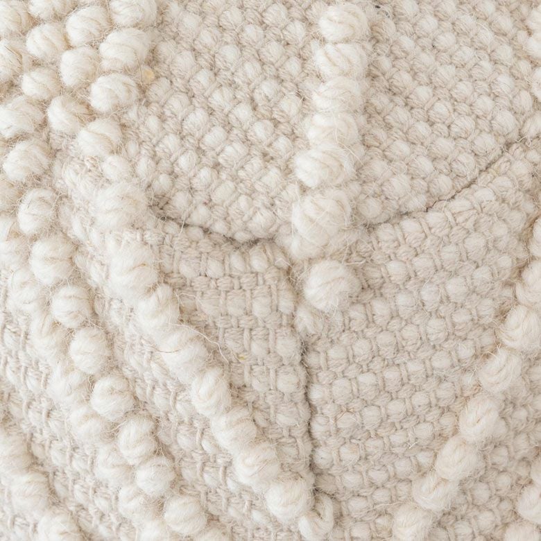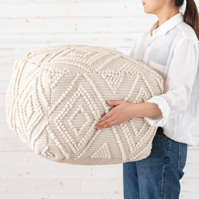 ころんとしたフォルムと、ポコポコとした編み目が何とも可愛らしいクッションは、ひとつひとつ職人さんによる手作り。 中材にはポリスチレンビーズがたっぷり入っているので、沈み込むという感じではなく、わりとしっかりとした座り心地。 見た目よりは軽いので持ち運んで好きな場所でお使いいただけます。