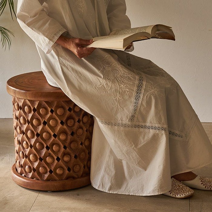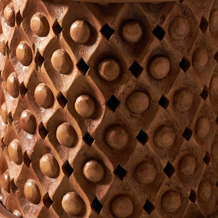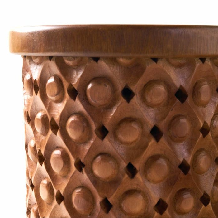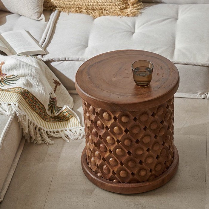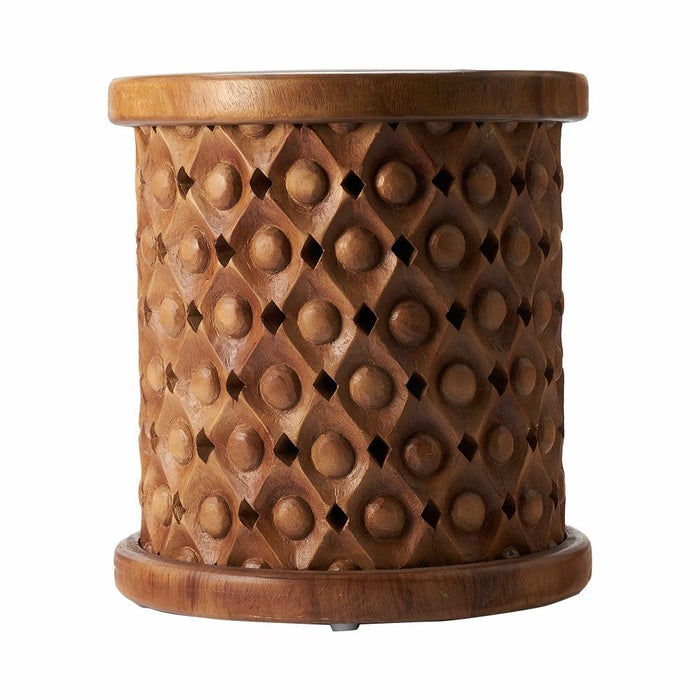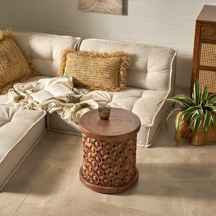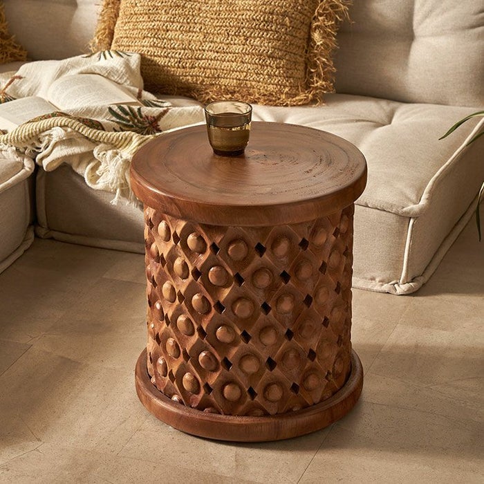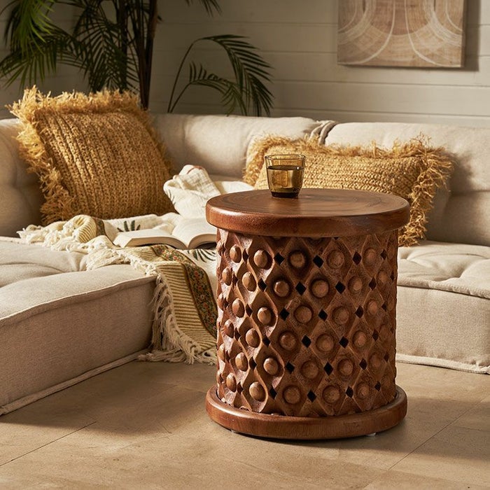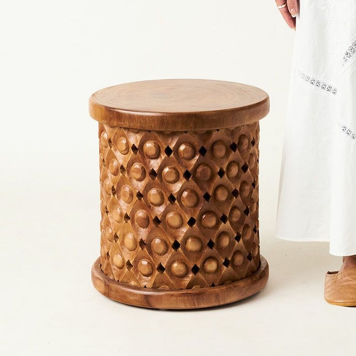 こちらのスツールは一本の木から削り出した材料をインドネシアの職人の手で一彫り、一彫り丁寧に彫刻が施されており、まるでアートのような仕上がり。木目をそのまま生かしているので二つとして同じものはありません。東南アジアのリゾートホテルのようなシックで品のいいインテリアにピッタリなスツールです。お手持ちのファブリックやレザーのソファとの合わせ、アタやラフィアの天然素材との合わせはインテリアに奥深さを与え、お部屋に落ち着いた雰囲気を与えてくれます。