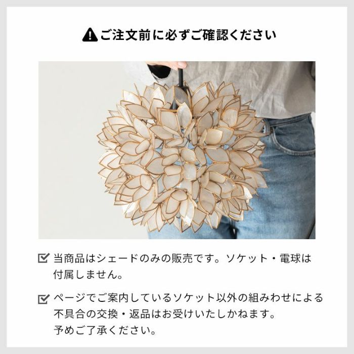 ※当商品はシェードのみです。ソケット・電球は付属していません。 ※壊れやすい商品ですので、開梱時にはご注意ください。 ※工業製品と異なりラフな作りとなっておりますことをご了承のうえお買い求めください。 ※貝殻のもつ小さなキズや汚れが残っている場合がございますが、天然素材ですのでご了承ください。 ※ハンドメイドのためお届けする商品によって色・サイズが多少異なることがあります。 ※モニターの種類やパソコンの環境により、実際の商品のお色と若干異なる場合がございます。 ※2015年4月より真鍮部分がゴールドにカラー変更しております。 |