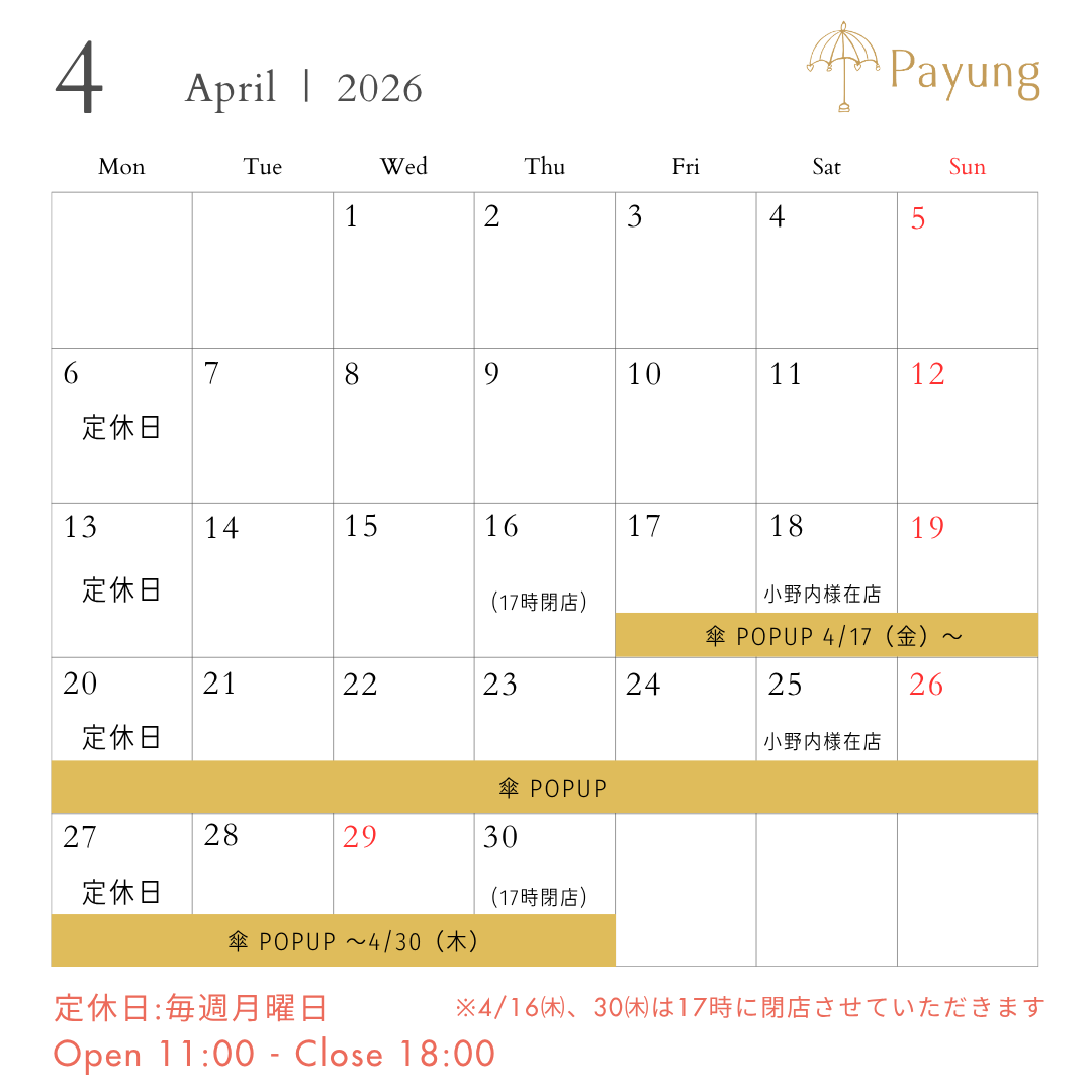 いつもPayungをご利用いただき誠にありがとうございます!! 春の陽気が心地よい季節となってまいりましたが皆さまいかがお過ごしでしょうか🌸 Payung芦屋店の4月の営業日についてご案内いたします 毎週火曜日~日曜日1 …