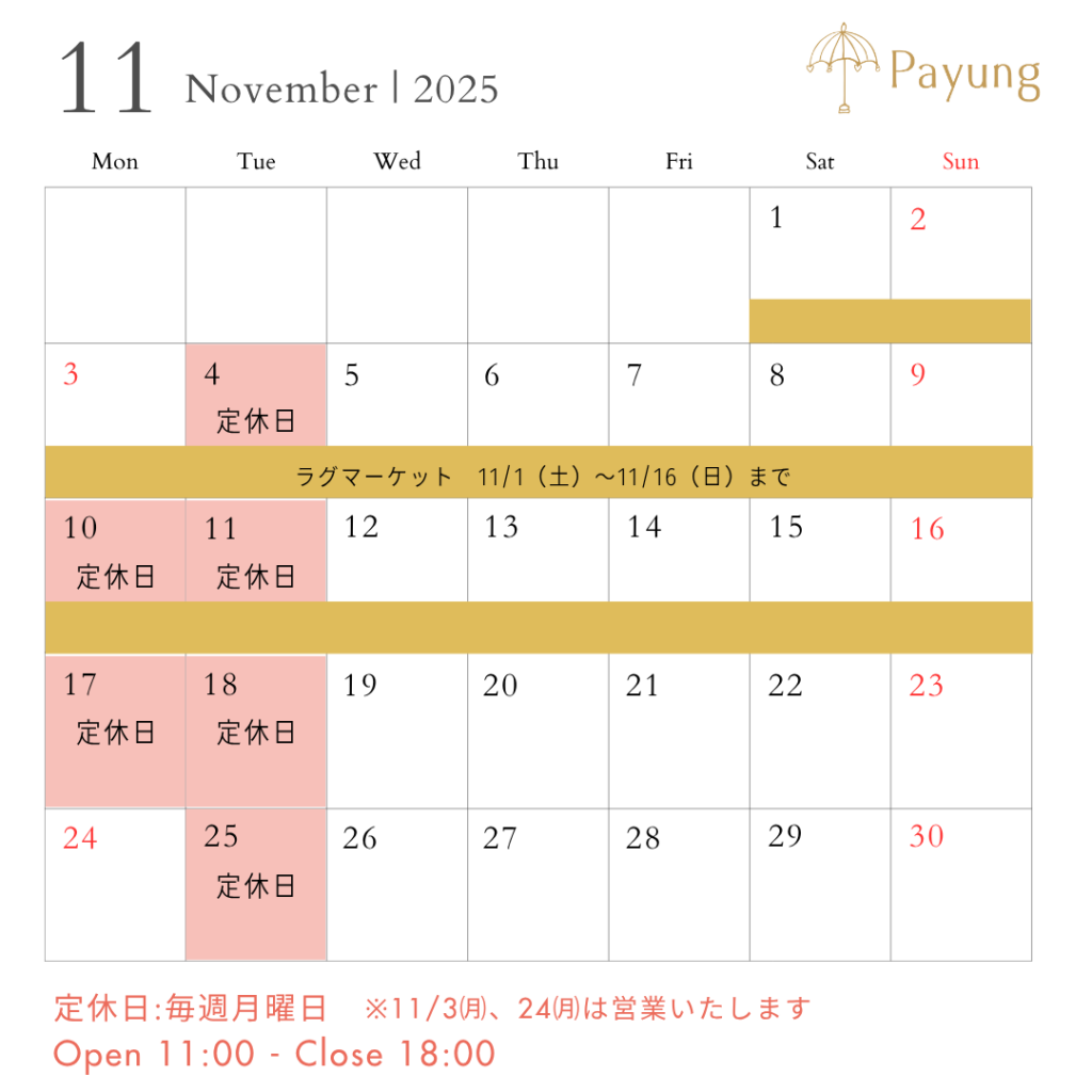 いつもPayungをご利用いただきありがとうございます! ここ数日で空気がひんやりとしてきました🍂季節の変わり目ですが皆さまいかがお過ごしでしょうか Payung芦屋店は11月も毎週水曜日~日曜日11時-18時まで営業い …