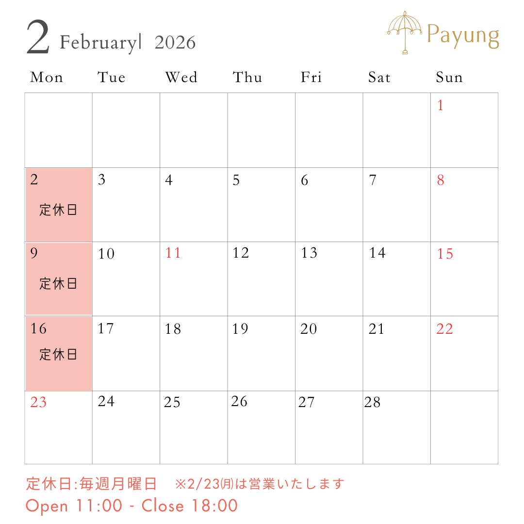 いつもPayungをご利用いただきありがとうございます!! 凛とした空気に冬の深まりを感じる2月⛄まだ寒さの残る日々ですが皆さまいかがお過ごしでしょうか Payung芦屋店は毎週火曜日~日曜日11:00-18:00 にて …